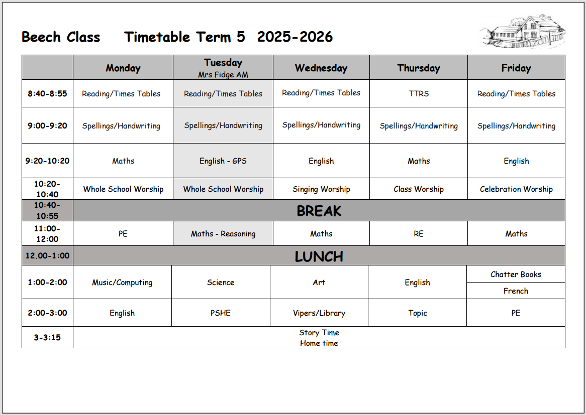 Our weekly timetable is at the bottom of the page. Please be aware that there may be days where the lessons need to be different due to staffing. I will make sure children who need support with change are told about changes when they arrive in the morning.