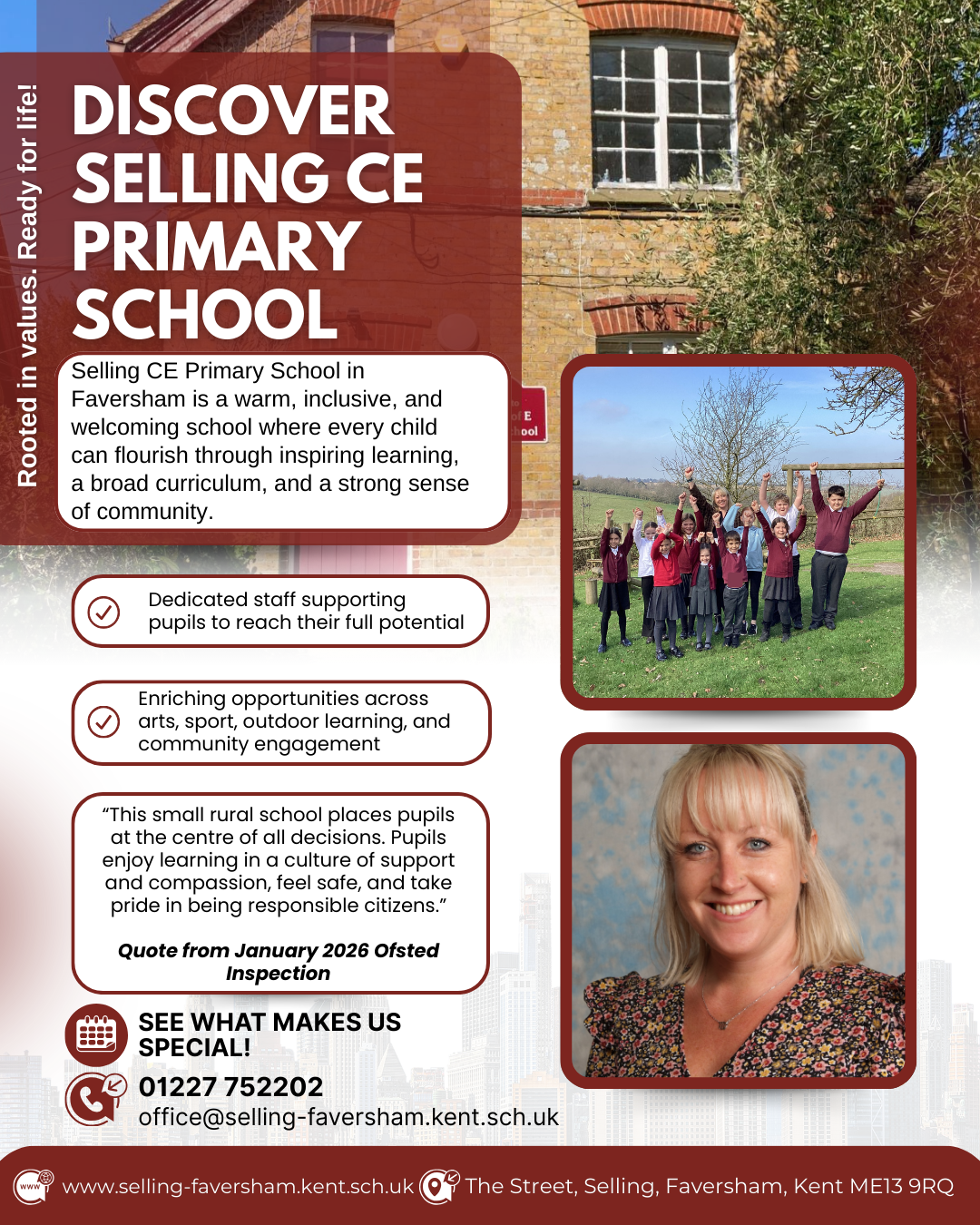 Children leaving Selling to move to Secondary education go to a variety of schools. In their final year at primary school pupils can, if parents wish, undertake the selection test for a Grammar school place (11 plus or Kent Test).