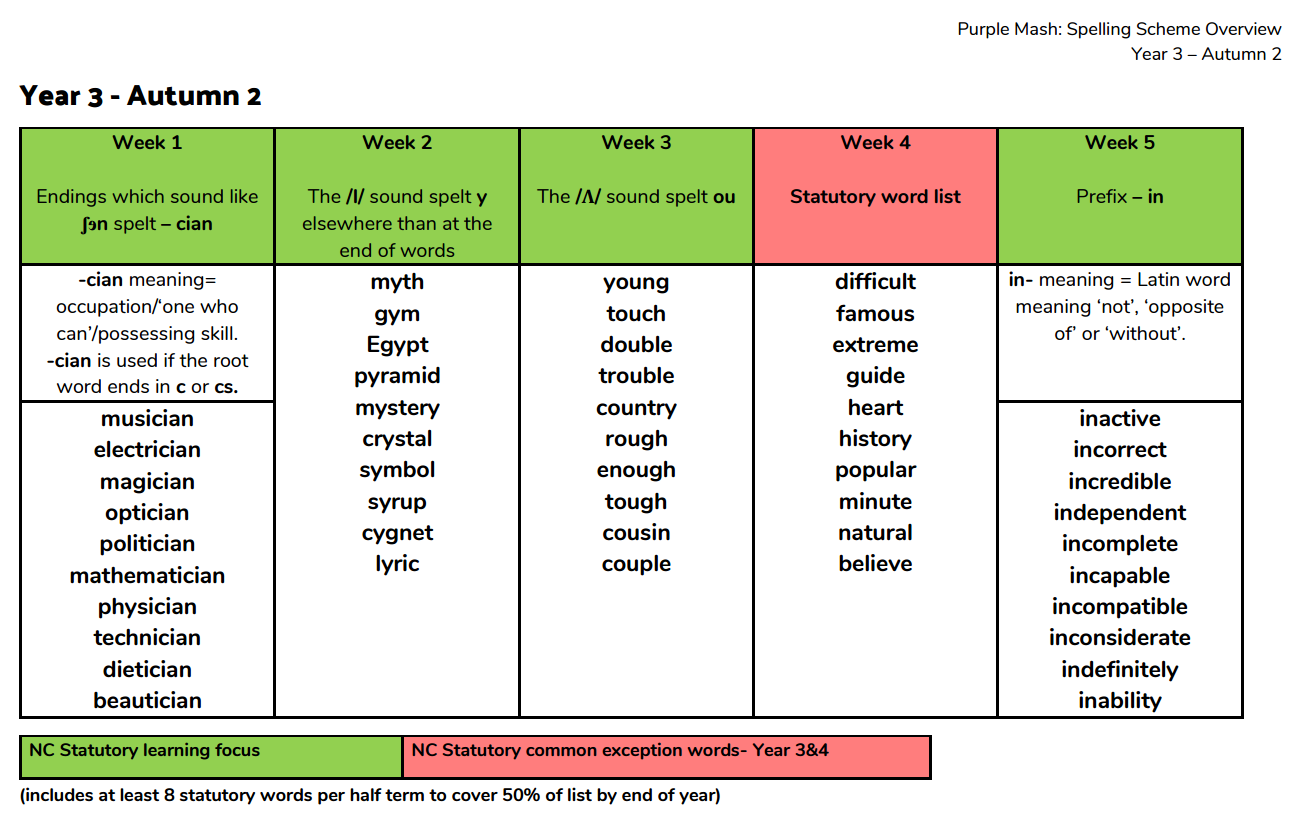 Spelling practice will take place daily at school. Children will be given a range of activities to complete throughout the week to improve their spelling and handwriting skills. Please see the Spelling document below which will show which spelling rule we’ll be looking at each week.